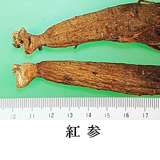| 備考 | 細根をつけたまま蒸し上げ乾燥したもの(日本産紅参)と,細根を除去し乾燥し圧したもの(北鮮,韓国産紅参)とがある.中国では比較的長い分枝根を付けてかこうしたものを「辺条紅参」,細根を除去して加工したものを「紅参須」と称する. | |||