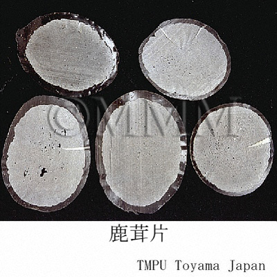 | 備考 | 脊椎動物門,哺乳綱(Mammalia),偶蹄目(Artiodactyla)のシカ科のマンシュウアカジカ Cervus (Cervus) elaphus L. var. xanthopygus Milne-Edwards(馬鹿),およびマンシュウジカ C. (Sika) nippon Temminck var. mantchuricus Swinhoe(梅花鹿,花鹿)の雄の幼角(袋角). 前者の幼角を「馬鹿茸」,後者からのものを「花鹿茸」または、「梅花鹿茸」と称しており,現在わが国に輸入される中国およびシベリア産のものはこの2種に限られ,特に前者が主である. | |||||