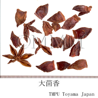 | 備考 | - 大茴香の効能は茴香(小茴香)に似ているが,大茴香は性が熱であり,中(内臓)を温める力が強い.寒を去り,疝を治療する. - 日本産の同属植物 Ilicium religiosum Sieb. et Zucc. シキミの果実は大茴香に酷似しているが,有毒成分 anisatinを含有するので混用してはならない. | |||||