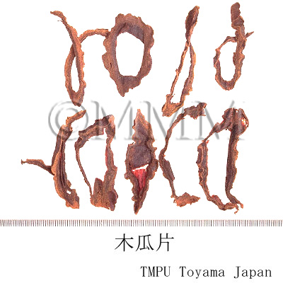 | 備考 | 日本産「和木瓜」は,バラ科(Rosaceae)の カリン Chaenomeles sinensis Koehne (= Pseudocydonia sinensis Schneid.) の成熟果実を二つに縦割して乾燥したもの.一般に日本,韓国の「木瓜」はこのものである.中国では「光皮木瓜」という. | ||||||