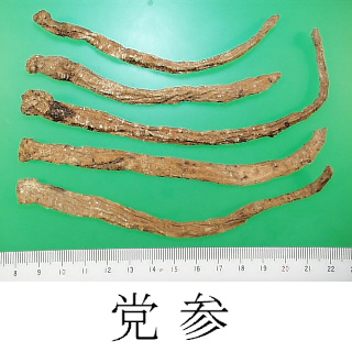 | 備考 | 『中華人民共和国薬典』収載品の C. pilosula, C. pilosula var. modesta, C. tangshen の他,四川省で C. subglobosa W.W.Sm., 四川,貴州,雲南省で C. tubulosa Kom., 四川,西蔵自治区で C. nervosa Nannf., C. canescens Nannf., 新彊ウイグル自治区で C. clematidea C.B.Clarke が使用される. 近年中国では「人参」の代用品として「党参」の需要が多い.「党参」の名前は清代の『本草従新』に初見するが,それ以来「人参」と「党参」の薬能の異同については二説がある.一つは「党参は清肺の功がある.ただし,医者はみだりに人参の代用品として党参を用いてかえって病気を悪化させている」というもの,一つは「党参は薬効が人参と同じである」とするものである.薬効の同等性については問題がありそうである. | ||||||