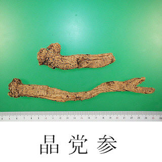 | 備考 | 『中華人民共和国薬典』収載品の C. pilosula, C. pilosula var. modesta, C. tangshen の他,四川省で C. subglobosa W.W.Sm., 四川,貴州,雲南省で C. tubulosa Kom., 四川,西蔵自治区で C. nervosa Nannf., C. canescens Nannf., 新彊ウイグル自治区で C. clematidea C.B.Clarke が使用される. 近年中国では「人参」の代用品として「党参」の需要が多い.「党参」の名前は清代の『本草従新』に初見するが,それ以来「人参」と「党参」の薬能の異同については二説がある.一つは「党参は清肺の功がある.ただし,医者はみだりに人参の代用品として党参を用いてかえって病気を悪化させている」というもの,一つは「党参は薬効が人参と同じである」とするものである.薬効の同等性については問題がありそうである. | ||||||