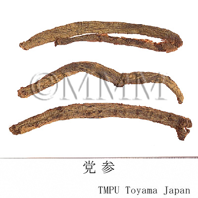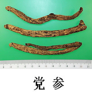 | 備考 | 『中華人民共和国薬典』収載品の C. pilosula, C. pilosula var. modesta, C. tangshen の他,四川省で C. subglobosa W.W.Sm., 四川,貴州,雲南省で C. tubulosa Kom., 四川,西蔵自治区で C. nervosa Nannf., C. canescens Nannf., 新彊ウイグル自治区で C. clematidea C.B.Clarke が使用される. 近年中国では「人参」の代用品として「党参」の需要が多い.「党参」の名前は清代の『本草従新』に初見するが,それ以来「人参」と「党参」の薬能の異同については二説がある.一つは「党参は清肺の功がある.ただし,医者はみだりに人参の代用品として党参を用いてかえって病気を悪化させている」というもの,一つは「党参は薬効が人参と同じである」とするものである.薬効の同等性については問題がありそうである. | ||||||