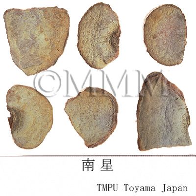 | 備考 | 「基源」: 日本産はムサシアブミ Arisaema ringens (Thunb.) Schott (九州産),その他,マムシグサ A. japonicum Blume,コウライテンナンショウ A. japonicum Blume var. atropureum (Engl.) Kitamura などの塊茎を輪切りにし石灰をまぶして乾燥したもの. 「薬能」:『湯液本草』(金代)の中で著者の王好古は「痰を治する功は,半夏と同じである」といっているが,半夏もまた辛散であるが脾胃の湿痰に専用するもので効用は同じであるが用い方が異なる.天南星の治療するところのものは,一般に風痰,湿痰が経路に入って引きおこした症候で,中風麻痺,口噤,身体の強ばり,筋脈拘攣,りょう癇,破傷風などである. | |||||