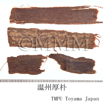 備考『日本薬局方』では3種の樹皮が規定され,magnolol を 0.8%以上含むこととされる.『中華人民共和国薬典』では厚朴(Magnoliae Officinalis Cortex)として M. officinalis の樹皮(川朴,湖北厚朴などと称す)と M. officinalis var. biloba(温朴,温州厚朴)の樹皮が規定される.樹皮(幹皮,枝皮)の他,根皮も用いられる.日本市場では中国産の厚朴を唐厚朴と総称する.韓国産はホオノキの樹皮以外に,クスノキ科のタブノキ Machilus thunbergii Sieb. et Zucc. の樹皮を「厚朴(薄朴)」と称し代用にすることがあるが,気味が全く異なる.