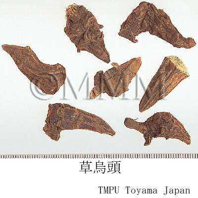 | 備考 | - 野生の Aconitum 属の塊根は「草烏頭」, 「草烏」, 「烏薬」, 「金牛七」, 「大草烏」, 「小黒牛」, 「血烏」, 「黄草烏」, 「藤草烏」, 「蔓烏薬」,「火焰子」, 「鉄棒鎚」など産地,種類によって名称が異なる. - 中国産草烏頭など:A. kusnezoffii(黒竜江), A. artemisaefolium Bar. et Skv.(遼寧), A. paniculigerum Nakai, A. sczukini Turcz.(以上, 東北地方), A. taipeicum Hand.-Mazz.(陝西), A. karakolicum Rap., A. soongaricum Stapf(以上, 新疆), A. sungpanense Hand.-Mazz.(陝西, 甘粛, 四川), A. hemsleyanum Pritz.(四川, 湖北, 湖南, 陝西), A. stylosum Stapf, A. transsectum Diels, A. delavayi Franch.(以上, 雲南) など多くのAconitum属植物の塊根. - 韓国産草烏頭:ミツバトリカブトA. triphyllum Nakai など数種のAconitum属植物の塊根. - 日本産草烏頭:オクトリカブトA. japonicum Thunb. の塊根. -『中華人民共和国薬典』には「川烏」(A. carmichaeli の母根,6月下旬~8月上旬採取)と「草烏」(A. kusnezoffii の塊根,秋季採取)が収載される.草烏の方が毒性及び効果が強い.烏頭は附子に比べて去風,鎮痛の効が勝り,強心,去寒の効は劣る. | ||||||