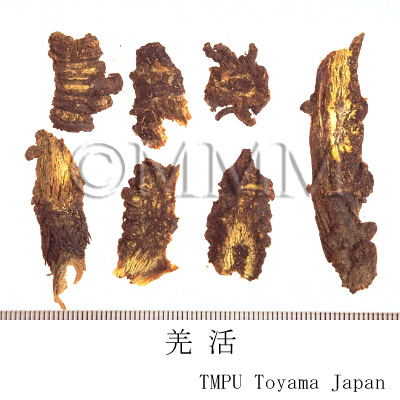 | 備考 | 韓国産の巻羌活はセリ科/Umbelliferae の チョウセンオニウド Ostericum koreanum Kitagawa (= Angelica koreana Maxim.) または ニオイウド Ostericum grosseserratum Kitagawa (= Angelica uchiyamana Yabe) の根と根茎である. また日本産の長羌活,巻羌活はともに シシウド Angelica pubescens Maxim. の根,根茎であるが,最近の和羌活はウコギ科 /Araliaceae のウド Aralia cordata Thunb. の根の細いものである. 中国産の独活はセリ科のAngelica属植物の根.羌活と独活はともに去風,勝湿の効があり,また痺を通じ,痛を止める.羌活は太陽経の薬で,燥散の性質が強く,よく発表,発汗させ,風寒表症に適用されるべきものである.独活は発表の効がなく,少陰腎経の薬で,細辛と共に用いて少陰の頭痛に効果がある.古人は羌活は遊風を治し,独活は伏風を治すといっており,また羌活は表に偏り,独活は裏に偏るともいっている. | |||||