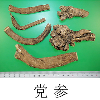 | 備考 | 『中華人民共和国薬典』収載品の C. pilosula, C. pilosula var. modesta, C. tangshen の他,四川省で C. subglobosa W.W.Sm., 四川,貴州,雲南省で C. tubulosa Kom., 四川,西蔵自治区で C. nervosa Nannf., C. canescens Nannf., 新彊ウイグル自治区で C. clematidea C.B.Clarke が使用される. 近年中国では「人参」の代用品として「党参」の需要が多い.「党参」の名前は清代の『本草従新』に初見するが,それ以来「人参」と「党参」の薬能の異同については二説がある.一つは「党参は清肺の功がある.ただし,医者はみだりに人参の代用品として党参を用いてかえって病気を悪化させている」というもの,一つは「党参は薬効が人参と同じである」とするものである.薬効の同等性については問題がありそうである. | ||||||