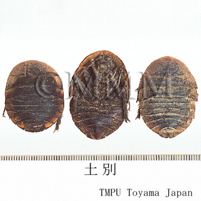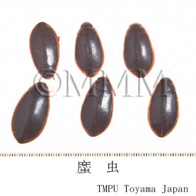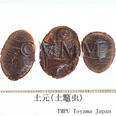 | 備考 | 基源動物は以下の通り. 1) シナゴキブリ (土鼈虫) Eupolyphaga sinensis Walker, 江蘇,浙江省産のものが,体がやや小さく,腹中に土を含まず,体が厚いわりに軽く品質良好で,「蘇土元」と称される.その他の地区のものは蘇土元より大型で,腹中に土を含み,重く品質次品である.「大土元」あるいは「漢土元」と称する. 2) サツマゴキブリ (東方后片蠊) Opisthoplatia orientalis Burmeister 本腫は,前胸背の前,側縁が淡黄色を呈しているので,「金辺土鼈」とも呼ばれる. 3) 冀地鼈 Polyphaga plancyi Bol. 北京に分布する. いずれも雌の全乾燥品が市販される.その他香港,台湾市場の䗪虫の一部は ゲンゴロウ科/Dytiscidaeの コガタノゲンゴロウ Cybister tripunctatus orientalis Gschew の乾燥虫体である. | |||||