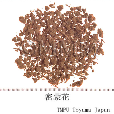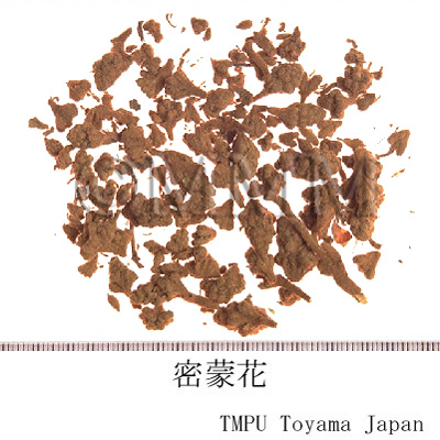 | 備考 | 中国市場では密蒙花の他,老密蒙花,老蒙花と称される.わが国に輸入される密蒙花は上記正條品であるが,ときに多量の芫花 - ジンチョウゲ科/Thymelaeaceaeの フジモドキ Daphne genkwa Sieb. et Zucc. の花蕾] の混入 (約17%)が認められる.中国湖北省黄崗,四川省雲陽等に産する密蒙花は,ジンチョウゲ科/Thymelaeaceae の ミツマタ Edgeworthia chrysantha Lindl. の花蕾であって,通常「新蒙花」または「蒙花珠」と称している.中国市場にはこのものも多く出まわっている. | |||||