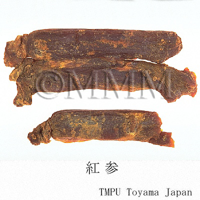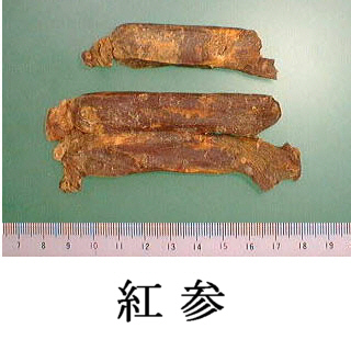 | 備考 | 細根をつけたまま蒸し上げ乾燥したもの(日本産紅参)と,細根を除去し乾燥し圧したもの(北鮮,韓国産紅参)とがある.中国では比較的長い分枝根を付けてかこうしたものを「辺条紅参」,細根を除去して加工したものを「紅参須」と称する. | |||