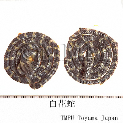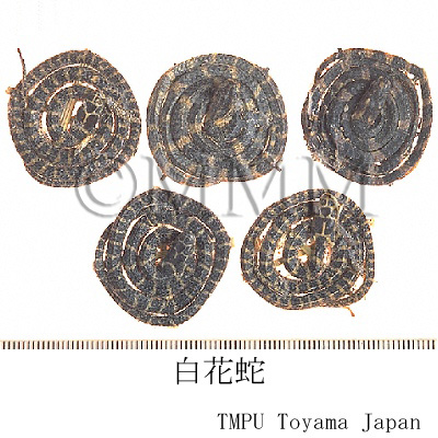 | 備考 | Agkistorodon acutus Gunther(蕲蛇,五歩蛇,白蛇,百歩蛇,棋盤蛇,褰鼻蛇,响尾蛇)の腹部を開いて内臓を取り出し,開いたまま円形平盤状になし炭火で乾燥したものを 「鯗蕲蛇」 と称し,内臓を取り出して開かず原形のまま円形にとぐろを巻かせて円盤状にし,炭火で乾燥したものを 「棍蕲蛇」 と称する.このヘビは薬用にするため江西省貴溪の祁盤山で培養しており,「祁蛇」,「正祁蛇」 とも称している. | |||||
