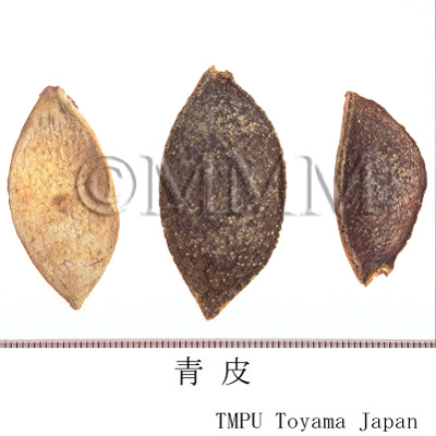 | 備考 | 5~6月に落下した幼果を集め,陽干する.「個青皮」ともいう.7~8月に採集した未成熟の果実の果皮に切れ込みを入れ,蔕を取ったものを「四花青皮」,「四化青皮」という.未熟果実の果皮の方がフラボノイド配糖体,シネフリンの含量が高い.抗酸化作用も強い. | |||||