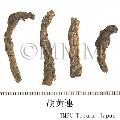 | 備考 | - 正倉院薬物の「黒黄連」は胡黄連で,このものの原植物は組織形態学(内鞘繊維の有無)及び成分化学(GC-MSによる比較)的検討から Picrorhiza scrophulariiflora であると考えられた.P. scrophulariiflora はネパール,中国のチベット自治区東南部,雲南省西北部及び四川省西部に分布する.『中華人民共和国薬典』収載品はこのものの根茎である.一方, P. kurrooa はインド,パキスタン,シッキム及びネパールなどに分布し,このものの根茎及び根はアーユルヴェーダで「Katuki」と称して黄疸,消化不良,発熱に用いられ,さらに現在では急性ウィルス性肝炎や気管支喘息にも応用されている. - 胡黄連は正倉院に納められてはいるが,大変高価で一般には入手不可能であった.そのため日本では代替品を探し,『証類本草』の附図からセンブリがこのものにあてられた.室町末期~江戸初期の頃であり,江戸初期にはそれが誤りであることに気づいている学者もいた.日本の民間薬としては代表的なセンブリ(当薬)はこうして開発された. - 中国東北諸省,朝鮮半島産の胡黄連はメギ科/Berberidaceae のタツタソウ(イトマキグサ)Jeffersonia dubia Benth. の根で 「鮮黄連」 ともいう. | |||||