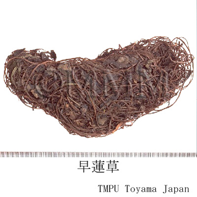 | 備考 | 中国南部の浙江,江蘇,上海地区では,オトギリソウ科/Hypericaceae の トモエソウ Hypericum ascyron L. の全草を,旱蓮草,紅旱蓮草などと称し薬用にする.また北方地区の河北,河南,陜西省などでは,バラ科/Rosaceae の Potentilla paradoxa Nutt. (仰臥委陵采) の全草を挫切したものを旱蓮草と称して薬用にしている.福建省漳州地区ではキク科/Compositae の ハマグルマ Wedelia prostrata Hemsl. を旱蓮草と称している. また台湾では,キク科/Compositae の クマノギク Wedelia chinensis (Osbeck) Merr. (= W. calendulacea Less.) の全草を旱蓮草,田窩草,黄花田路草,蛇舌黄などと称している. | |||||