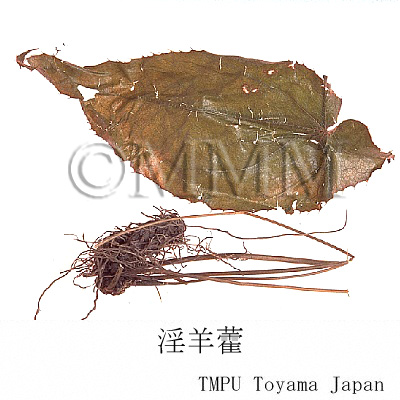 日本産はイカリソウ E. grandiflorum Morr. var. thunbergianum Nakai (長野県産) およびウラジロイカリソウ E. sempervirens Nakai var. hypoglaucum Ohwi (新潟県産)の 葉または地上部を乾燥したもの.日本では地下部を「イカリソウ根」と称して別に市販される (B2).
