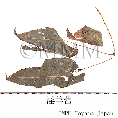 日本産はイカリソウ E. grandiflorum Morr. var. thunbergianum Nakai (長野県産) およびウラジロイカリソウ E. sempervirens Nakai var. hypoglaucum Ohwi (新潟県産)の 葉または地上部を乾燥したもの.日本では地下部を「イカリソウ根」と称して別に市販される (B2).