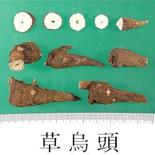 | 備考 | - 野生の Aconitum 属の塊根は「草烏頭」, 「草烏」, 「烏薬」, 「金牛七」, 「大草烏」, 「小黒牛」, 「血烏」, 「黄草烏」, 「藤草烏」, 「蔓烏薬」,「火焰子」, 「鉄棒鎚」など産地,種類によって名称が異なる. - 中国産草烏頭など:A. kusnezoffii(黒竜江), A. artemisaefolium Bar. et Skv.(遼寧), A. paniculigerum Nakai, A. sczukini Turcz.(以上, 東北地方), A. taipeicum Hand.-Mazz.(陝西), A. karakolicum Rap., A. soongaricum Stapf(以上, 新疆), A. sungpanense Hand.-Mazz.(陝西, 甘粛, 四川), A. hemsleyanum Pritz.(四川, 湖北, 湖南, 陝西), A. stylosum Stapf, A. transsectum Diels, A. delavayi Franch.(以上, 雲南) など多くのAconitum属植物の塊根. - 韓国産草烏頭:ミツバトリカブトA. triphyllum Nakai など数種のAconitum属植物の塊根. - 日本産草烏頭:オクトリカブトA. japonicum Thunb. の塊根. -『中華人民共和国薬典』には「川烏」(A. carmichaeli の母根,6月下旬~8月上旬採取)と「草烏」(A. kusnezoffii の塊根,秋季採取)が収載される.草烏の方が毒性及び効果が強い.烏頭は附子に比べて去風,鎮痛の効が勝り,強心,去寒の効は劣る. | ||||||