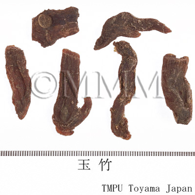 | 備考 | 『中華人民共和国薬典』には玉竹の原植物として,Polygonatum odoratum が規定される.しかし中国市場には P. macropodium なども見られ,さらに香港市場で黄精の原植物とされる P. sibiricum 等が確認された.玉竹の薬効は黄精と似ているが,玉竹は陰を補う作用が強く,黄精は気を補う作用が強い.臨床では使い分けられている. | |||||