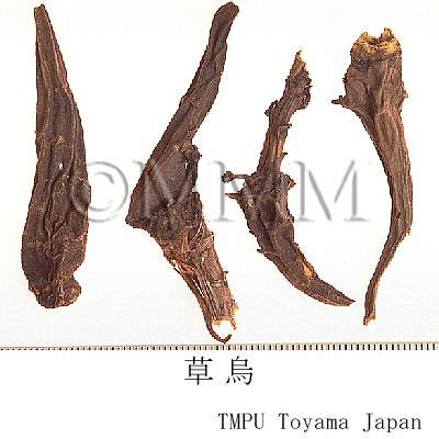 | 備考 | - 野生の Aconitum 属の塊根は「草烏頭」, 「草烏」, 「烏薬」, 「金牛七」, 「大草烏」, 「小黒牛」, 「血烏」, 「黄草烏」, 「藤草烏」, 「蔓烏薬」,「火焰子」, 「鉄棒鎚」など産地,種類によって名称が異なる. - 中国産草烏頭など:A. kusnezoffii(黒竜江), A. artemisaefolium Bar. et Skv.(遼寧), A. paniculigerum Nakai, A. sczukini Turcz.(以上, 東北地方), A. taipeicum Hand.-Mazz.(陝西), A. karakolicum Rap., A. soongaricum Stapf(以上, 新疆), A. sungpanense Hand.-Mazz.(陝西, 甘粛, 四川), A. hemsleyanum Pritz.(四川, 湖北, 湖南, 陝西), A. stylosum Stapf, A. transsectum Diels, A. delavayi Franch.(以上, 雲南) など多くのAconitum属植物の塊根. - 韓国産草烏頭:ミツバトリカブトA. triphyllum Nakai など数種のAconitum属植物の塊根. - 日本産草烏頭:オクトリカブトA. japonicum Thunb. の塊根. -『中華人民共和国薬典』には「川烏」(A. carmichaeli の母根,6月下旬~8月上旬採取)と「草烏」(A. kusnezoffii の塊根,秋季採取)が収載される.草烏の方が毒性及び効果が強い.烏頭は附子に比べて去風,鎮痛の効が勝り,強心,去寒の効は劣る. | ||||||