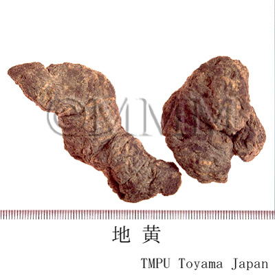 | 備考 | 日本ではアカヤジオウに由来する地黄はほとんど市場性がない.奈良県でわずかに系統保存のための栽培が行われている.フクチヤマ1号(カイケイジオウ×アカヤジオウ)が開発されている.中国ではカイケイジオウの新鮮な根を鮮地黄,乾燥したものを生地黄(日本でいう乾地黄),蒸して乾燥したものを熟地黄と称す.熟地黄は黄酒(紹興酒など)を用いるかまたはそのまま蒸し器で蒸し,その後日光で乾燥する.「蒸す-乾燥」の操作を9回繰り返す.乾地黄,生地黄は清熱涼血薬として熱証に用い,熟地黄は補血薬として虚寒証に用いる. | ||||||