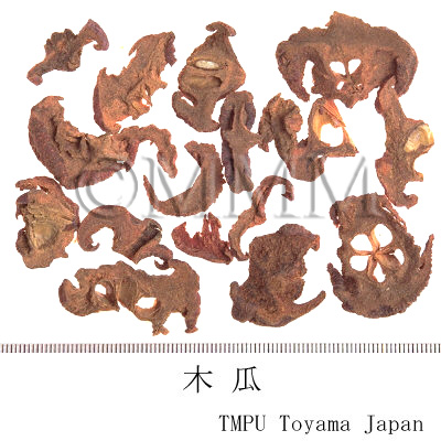 | 備考 | 日本産「和木瓜」は,バラ科(Rosaceae)の カリン Chaenomeles sinensis Koehne (= Pseudocydonia sinensis Schneid.) の成熟果実を二つに縦割して乾燥したもの.一般に日本,韓国の「木瓜」はこのものである.中国では「光皮木瓜」という. | ||||||