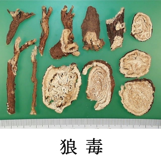 生薬名 入手時名称 狼毒 正式名称 狼毒 日本語読み ろうどく, Rōdoku 現地読み Bailangdu ラテン名 Euphorbiae Pallasii Radix 原植物名 Euphorbia pallasii Turcz.原植物科名 Euphorbiaceae, トウダイグサ科 薬用部位 分類 植物性生薬 細分類 根 産地情報 中華人民共和国, 甘粛省 入手先情報 中華人民共和国, 甘粛省蘭州市 , 甘粛省中薬材零售批発貿易市場 入手年月日 1993/07/31 蒐集者 難波恒雄, 他 TMPW No 13623