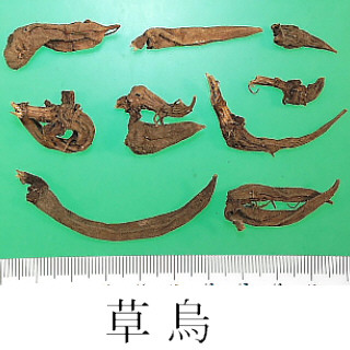 | 備考 | - 野生の Aconitum 属の塊根は「草烏頭」, 「草烏」, 「烏薬」, 「金牛七」, 「大草烏」, 「小黒牛」, 「血烏」, 「黄草烏」, 「藤草烏」, 「蔓烏薬」,「火焰子」, 「鉄棒鎚」など産地,種類によって名称が異なる. - 中国産草烏頭など:A. kusnezoffii(黒竜江), A. artemisaefolium Bar. et Skv.(遼寧), A. paniculigerum Nakai, A. sczukini Turcz.(以上, 東北地方), A. taipeicum Hand.-Mazz.(陝西), A. karakolicum Rap., A. soongaricum Stapf(以上, 新疆), A. sungpanense Hand.-Mazz.(陝西, 甘粛, 四川), A. hemsleyanum Pritz.(四川, 湖北, 湖南, 陝西), A. stylosum Stapf, A. transsectum Diels, A. delavayi Franch.(以上, 雲南) など多くのAconitum属植物の塊根. - 韓国産草烏頭:ミツバトリカブトA. triphyllum Nakai など数種のAconitum属植物の塊根. - 日本産草烏頭:オクトリカブトA. japonicum Thunb. の塊根. -『中華人民共和国薬典』には「川烏」(A. carmichaeli の母根,6月下旬~8月上旬採取)と「草烏」(A. kusnezoffii の塊根,秋季採取)が収載される.草烏の方が毒性及び効果が強い.烏頭は附子に比べて去風,鎮痛の効が勝り,強心,去寒の効は劣る. | ||||||
