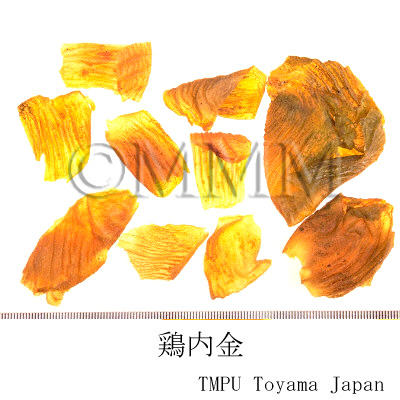 | 備考 | 中国ではニワトリの各種品種として「九斤鶏」,「狼山鶏」(岔河大鶏),「寿光鶏」,「大骨鶏」(大鶏, 高装鶏),「北京油鶏」,「桃源鶏」,「浦東鶏」(三黄鶏, 塘鶏),「来亨鶏」,「澳州黒鶏」などがある.香港市場品は恐らく「寿光鶏」(広東省産)のものであろう. 別名として「鶏肫皮」(遼寧, 山西, 山東, 湖北, 河南),「鶏針皮」(河北),「鶏中金」, 「化石胆」, 「化骨胆」(山西),「鶏合子」,「鶏膍胵」(山東),「鶏胃皮」(甘粛),「鶏食皮」,「鶏肚子」(河南),「鶏膆子」(新彊),「鶏灰皮」(江西),「鶏内筋」, 「鶏くん殻」(四川),「鶏肫子」(陜西),「鶏黄皮」(広西)などがある.ある地区では アヒル Anas platyrhnchos L. var. domesticus L. の胃の内壁である「鴨内金」を鶏内金にあてることがあるが,偽品である. | |||||