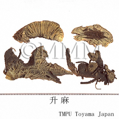 備考中国南部でキク科 Serratula chinensis S. Moore の根が使用される(広升麻).Cimicifuga属由来の升麻中にバラ科 Aruncus sylvester Kostel の根茎が混入されることがある.近年中国では升麻としてキツネノマゴ科 Strobilanthes forrestii Diels の根茎が流通するが,偽品であり注意を要する.