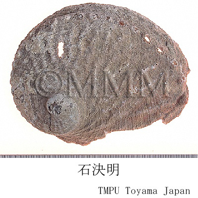 | 備考 | ミミガイ科(Haliotidae)の次の3種のアワビ類の殻が起源とされている. 1.九孔鮑 フクトコブシ Haliotis diversicolor Reeve(別名:光底石決明,九孔螺,鮑魚).福建省,広東省および海南島などの暖海に分布する. 2.盤大鮑 クロアワビ Haliotis discue Reeve (= Notohaliotis discus Reeve) (別名:毛底石決明,石蕨明,朱子房,千里光). 遼寧,山東省沿岸に分布する. 3.羊鮑 マアナゴ Haliotis gigantea Gmelin(別名:台湾石決明).南海一帯に分布する. このほか,大鮑 アワビ Haliotis gigantea Gmelin (大型アワビは現在メカイアワビ Notohaliotis sieboldi Reeve,クロアワビ Notohaliotis discus Reeve,マダカアワビ Notohaliotis gigantea Gmelinに分けられている.) を起源動物とすることもある.日本ではアワビの他トコブシ Haliotis diversicolor aquatilis Reeve (= Sulculus supertexta Lischke) の貝殻も用いられる. | |||||