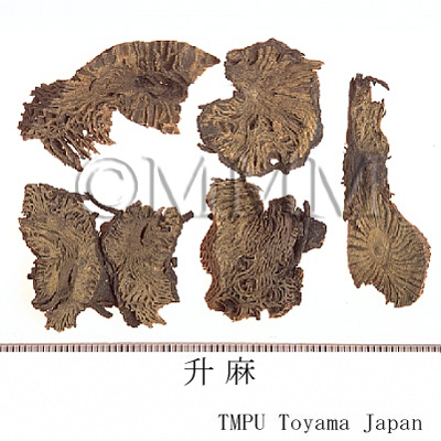 | 備考 | 中国南部でキク科 Serratula chinensis S. Moore の根が使用される(広升麻).Cimicifuga属由来の升麻中にバラ科 Aruncus sylvester Kostel の根茎が混入されることがある.近年中国では升麻としてキツネノマゴ科 Strobilanthes forrestii Diels の根茎が流通するが,偽品であり注意を要する. | ||||||