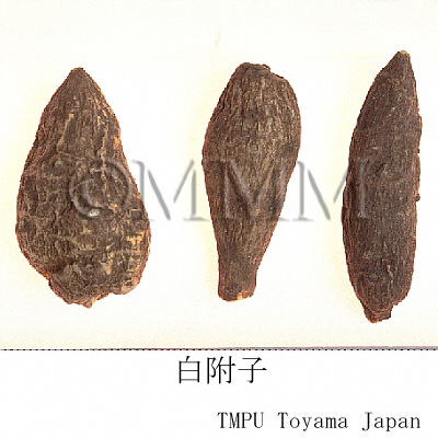 日本産白河附子 (Aconitum japonicumの塊根): 塩水に浸したのち石灰をまぶして乾燥したもの.