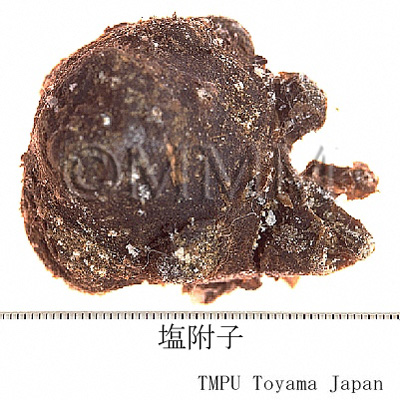 - 中国産塩附子 (Aconitum carmichaeliの子根): 塩水とにがり水の混液につけた半乾燥品.