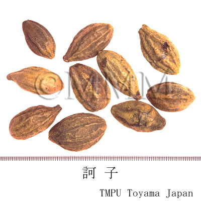 備考アーユルヴェーダ(インド医学)における主要薬物の一つで,生薬名を「ハリータキー」という.果実の形や産地の異なる7種類のハリータキーがあるとされ,ヒマラヤ産で丸い Vijaya が最良とされる.インドでは慢性便秘,慢性潰瘍,消化不良,気管支炎,咳,喘息,かすれ声,下痢,寄生虫,出血など種々の疾患に応用される.ハリータキーに,アーマラカ(余甘子),ヴィビータカ(毛訶子)を集めたものをトリパラ(三果)といい,散剤,飲料,その他の剤形として強壮や抗老化に用いられる.この薬物はチベットへ伝わり,チベット生薬名を「アルラ A-ru-la」または「アルー A-ru」という.チベット医学では一切の疾病を治す万能薬とされ,薬師如来の象徴とされる.中国では,唐代に著された『新修本草』に「訶梨勒」の名で初めて収載されるが,それ以前に伝わり,用いられていた可能性がある.「訶梨勒」は日本へも奈良時代に鑑真和尚によってもたらされている.