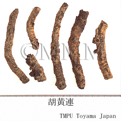 | 備考 | - 正倉院薬物の「黒黄連」は胡黄連で,このものの原植物は組織形態学(内鞘繊維の有無)及び成分化学(GC-MSによる比較)的検討から Picrorhiza scrophulariiflora であると考えられた.P. scrophulariiflora はネパール,中国のチベット自治区東南部,雲南省西北部及び四川省西部に分布する.『中華人民共和国薬典』収載品はこのものの根茎である.一方, P. kurrooa はインド,パキスタン,シッキム及びネパールなどに分布し,このものの根茎及び根はアーユルヴェーダで「Katuki」と称して黄疸,消化不良,発熱に用いられ,さらに現在では急性ウィルス性肝炎や気管支喘息にも応用されている. - 胡黄連は正倉院に納められてはいるが,大変高価で一般には入手不可能であった.そのため日本では代替品を探し,『証類本草』の附図からセンブリがこのものにあてられた.室町末期~江戸初期の頃であり,江戸初期にはそれが誤りであることに気づいている学者もいた.日本の民間薬としては代表的なセンブリ(当薬)はこうして開発された. - 中国東北諸省,朝鮮半島産の胡黄連はメギ科/Berberidaceae のタツタソウ(イトマキグサ)Jeffersonia dubia Benth. の根で 「鮮黄連」 ともいう. | |||||