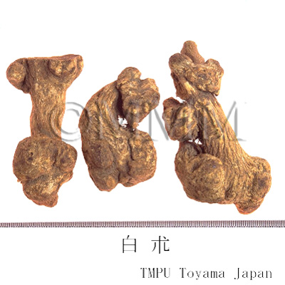 | 備考 | 日本及び韓国産は Atractylodes japonica の根茎の周皮を除いたもので,「三好白朮」,「玉白朮」,「嫩根白朮」などと称する.中国産白朮はすべて Atractylodes macrocephala を基源とし,産地及び加工法の違いにより「浙朮」,「天生朮」,「冬朮」,「野朮」など多様な呼称がある.『中華人民共和国薬典』に規定される白朮 (Atractylodis Macrocephalae Rhizoma, Largehead Atractylodes Rhizome) はこのものである.日本産白朮を「和白朮」,中国産白朮を「唐白朮」ともいう.2種ともに精油の主成分は atractylone である. 白朮とその同類生薬である蒼朮の薬効については,その健脾,燥湿を目的とするのは同じであるが,白朮は健脾(健胃)の力が比較的強く,蒼朮は燥湿(利水,利尿,発汗)の力が優るとされている.そのため,脾弱の虚証には白朮を用い,温盛の実証には蒼朮を多く用いる. | |||||