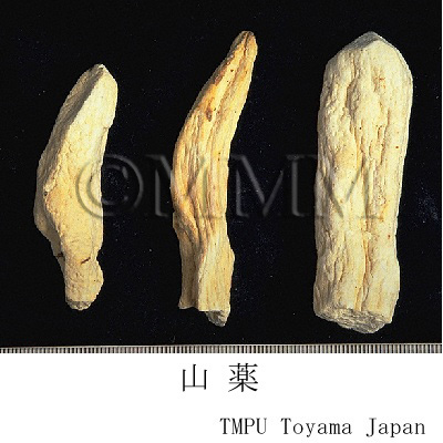 | 備考 | 日局18には ヤマノイモ Dioscorea japonica と ナガイモ D. batatas が,『中華人民共和国薬典 2020年版』には D. opposita がそれぞれ規定される.河南省の山薬は「淮山薬」,「淮山」と称され,D. opposita に由来し,一方広西壮族自治区の山薬は ダイジョ D. alata L. に由来する. 日本産の山薬は食用として栽培されたナガイモを原料とする.ナガイモは食用として広く栽培され,多数の品種がある.品種はナガイモ群,イチョウイモ群,丹波イモ群に大別される.ヤマノイモとの中間型もある. 台湾産の山薬は D. alata L. や D. doryphora Hance,その他偽品としてヒルガオ科 (Convolvulaceae)の アメリカイモ Ipomoea batatas (L.) Poir の塊根がある. 日本産と中国産では加工方法にも違いがあり,日本産は皮を剥いだ後そのまま加熱乾燥するが,中国産は圧縮して水分をある程度除去して乾燥する(毛条山薬)かまたはチョーク状に加工する(光山薬).日本産の品質が良いとされる. | ||||||
