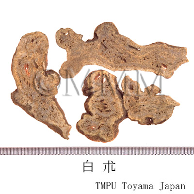 | 備考 | 日本及び韓国産は Atractylodes japonica の根茎の周皮を除いたもので,「三好白朮」,「玉白朮」,「嫩根白朮」などと称する.中国産白朮はすべて Atractylodes macrocephala を基源とし,産地及び加工法の違いにより「浙朮」,「天生朮」,「冬朮」,「野朮」など多様な呼称がある.『中華人民共和国薬典』に規定される白朮 (Atractylodis Macrocephalae Rhizoma, Largehead Atractylodes Rhizome) はこのものである.日本産白朮を「和白朮」,中国産白朮を「唐白朮」ともいう.2種ともに精油の主成分は atractylone である. 白朮とその同類生薬である蒼朮の薬効については,その健脾,燥湿を目的とするのは同じであるが,白朮は健脾(健胃)の力が比較的強く,蒼朮は燥湿(利水,利尿,発汗)の力が優るとされている.そのため,脾弱の虚証には白朮を用い,温盛の実証には蒼朮を多く用いる. | |||||
