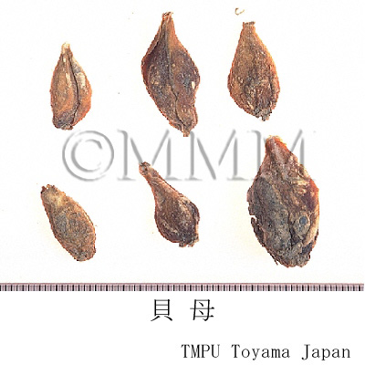 | 備考 | 貝母は種類が多く,主なものには次のものがある. - 浙貝母 (浙貝) : Fritillaria thunbergii Miq. - 湖北貝母:F. hupehensis Hsiao et K.C. Hsia - 川貝母 (川貝) : F. cirrhosa D.Don, F. unibracteata Hsiao et K.C.Hsia, F. przewalskii Maxim. - 炉貝:F. delavayi Franch. - 伊貝母 (伊貝) : F. pallidiflora Schrenk, F. walujewii Regel - 平貝母 (平貝) : F. ussuriensis Maxim. これらは,『中華人民共和国薬典』にそれぞれ別の条項で収載される(炉貝は川貝母に含まれる).貝母は化痰薬とされるが大きく,浙貝母,湖北貝母のグループと川貝母,炉貝,伊貝,平貝のグループに分けられ,前者は咳嗽の他,瘰癧や癰腫瘡毒にも応用され,後者は陰虚や肺熱の咳嗽に応用される. 日本産貝母は浙貝母と同じアミガサユリ(バイモ)の鱗茎で奈良県で栽培され,「大和貝母」とも称される.烏頭類生薬といっしょに用いてはならない.川貝母の名前は『景岳全書』(1624年)に初見する. | ||||||