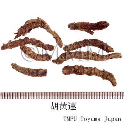 | 備考 | - 正倉院薬物の「黒黄連」は胡黄連で,このものの原植物は組織形態学(内鞘繊維の有無)及び成分化学(GC-MSによる比較)的検討から Picrorhiza scrophulariiflora であると考えられた.P. scrophulariiflora はネパール,中国のチベット自治区東南部,雲南省西北部及び四川省西部に分布する.『中華人民共和国薬典』収載品はこのものの根茎である.一方, P. kurrooa はインド,パキスタン,シッキム及びネパールなどに分布し,このものの根茎及び根はアーユルヴェーダで「Katuki」と称して黄疸,消化不良,発熱に用いられ,さらに現在では急性ウィルス性肝炎や気管支喘息にも応用されている. - 胡黄連は正倉院に納められてはいるが,大変高価で一般には入手不可能であった.そのため日本では代替品を探し,『証類本草』の附図からセンブリがこのものにあてられた.室町末期~江戸初期の頃であり,江戸初期にはそれが誤りであることに気づいている学者もいた.日本の民間薬としては代表的なセンブリ(当薬)はこうして開発された. - 中国東北諸省,朝鮮半島産の胡黄連はメギ科/Berberidaceae のタツタソウ(イトマキグサ)Jeffersonia dubia Benth. の根で 「鮮黄連」 ともいう. | |||||