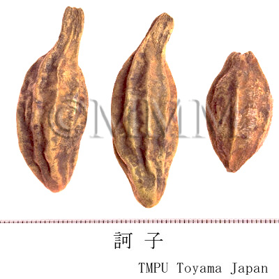 | 備考 | アーユルヴェーダ(インド医学)における主要薬物の一つで,生薬名を「ハリータキー」という.果実の形や産地の異なる7種類のハリータキーがあるとされ,ヒマラヤ産で丸い Vijaya が最良とされる.インドでは慢性便秘,慢性潰瘍,消化不良,気管支炎,咳,喘息,かすれ声,下痢,寄生虫,出血など種々の疾患に応用される.ハリータキーに,アーマラカ(余甘子),ヴィビータカ(毛訶子)を集めたものをトリパラ(三果)といい,散剤,飲料,その他の剤形として強壮や抗老化に用いられる.この薬物はチベットへ伝わり,チベット生薬名を「アルラ A-ru-la」または「アルー A-ru」という.チベット医学では一切の疾病を治す万能薬とされ,薬師如来の象徴とされる.中国では,唐代に著された『新修本草』に「訶梨勒」の名で初めて収載されるが,それ以前に伝わり,用いられていた可能性がある.「訶梨勒」は日本へも奈良時代に鑑真和尚によってもたらされている. | |||||