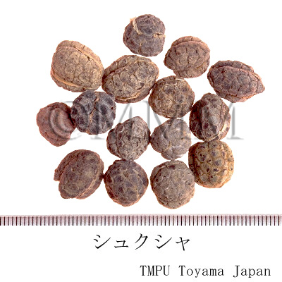 | 備考 | 『中華人民共和国薬典』では「砂仁」として Amomum villosum Lour.(陽春砂),A. villosum Lour. var. xanthioides T.L. Wu et Senjen (= A. xanthioides Wall.),A. longiligulare T.L. Wu の成熟果実を規定している. 『日本薬局方』第16改正まではシュクシャを Amomum xanthioides Wallich の種子の塊と規定していた.第17改正からは Amomum villosum Lour. var. xanthioides T. L. Wu & S. J. Chen, Amomum villosum Lour. var. villosum or Amomum longiligulare T. L. Wu. の種子の塊としている. 日本産伊豆縮砂:白手と黒手があり,黒手種は ハナミョウガ Alpinia japonica (Thunb. ex Murray) Miq.または(アオノクマタケラン A. intermedia Gagnep.)の仮種皮を除いた種子.白手種は ゲットウ A. speciosa (J.C. Wendl.) K. Schum. の種子で仮種皮を伴い,品質は良くない. 台湾産の砂仁はゲットウの種子. | |||||