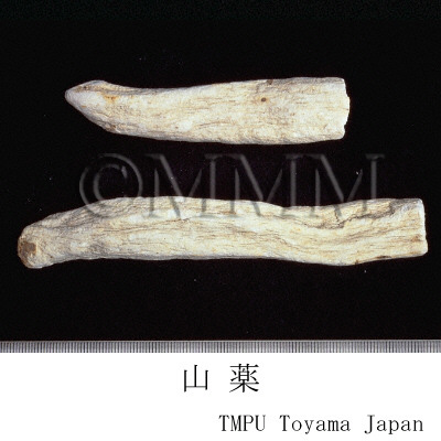 | 備考 | 日局18には ヤマノイモ Dioscorea japonica と ナガイモ D. batatas が,『中華人民共和国薬典 2020年版』には D. opposita がそれぞれ規定される.河南省の山薬は「淮山薬」,「淮山」と称され,D. opposita に由来し,一方広西壮族自治区の山薬は ダイジョ D. alata L. に由来する. 日本産の山薬は食用として栽培されたナガイモを原料とする.ナガイモは食用として広く栽培され,多数の品種がある.品種はナガイモ群,イチョウイモ群,丹波イモ群に大別される.ヤマノイモとの中間型もある. 台湾産の山薬は D. alata L. や D. doryphora Hance,その他偽品としてヒルガオ科 (Convolvulaceae)の アメリカイモ Ipomoea batatas (L.) Poir の塊根がある. 日本産と中国産では加工方法にも違いがあり,日本産は皮を剥いだ後そのまま加熱乾燥するが,中国産は圧縮して水分をある程度除去して乾燥する(毛条山薬)かまたはチョーク状に加工する(光山薬).日本産の品質が良いとされる. | ||||||