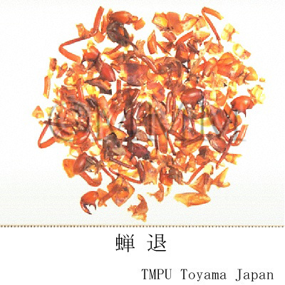| 原植物名 | Cryptotympana atrata Stal1, Platylomia pieli Kato, Oncotympana maculaticollis Distant2, Tanna chekiangensis Ouchi, Graptopsaltria tienta Karsch, Lyristes pekinensis Haupt, Lyristes atrofasciatus Chou et Lei, Meimuna mongolica Distant3, Leptosemia sakaii Matsumura4, Platypleura kaempferi Butler5, またはそれらの同属動物 (スジアカクマゼミ1, ミンミンゼミ2, コマゼミ3, ホソヒグラシ4, ニイニイゼミ5) | |||||