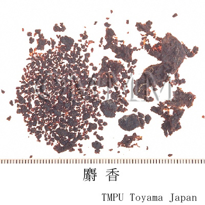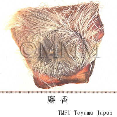 | 備考 | 市販品は通常 「玉麝香」 と 「身麝香」 がある. 1)玉麝香は中国では整麝香,整香,毛香などと称され,袋状腺嚢,いわゆる麝香嚢に入ったものである.日本に輸入されるものはネパールもしくはチベット産の 「本口手」 と称されるものがほとんどで,わずかに中国雲南,四川省の 「雲南手」 がある. 2)身麝香は,中国で麝香仁,散香と称されて,麝香嚢内に包蔵されている中身である.芳香が濃厚で,久しく香りを聞くと独特の有騒性の香味が感じられ,味はやや苦く,口から鼻にぬける香味があるものが佳品である.現在市販の麝香はすべて人工的な加工が施され,純品はないが,そのうちでも化学的評価法によって muscone 2%以上,C19-steroid 0.5%以上のものは一応信頼しべき麝香であるとされている.高級香水にも配合される. | ||||||