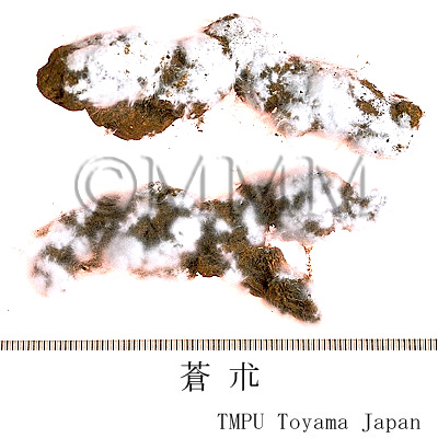 | 備考 | 茅朮(毛朮,漢蒼朮)は A. lancea ホソバオケラ(湖北,江西,江蘇省などに産す),津蒼朮(山蒼朮)は A. chinensis シナオケラ(河北,河南,山西省に産す),北鮮蒼朮は A. koreana Kitam. (= A. lancea DC. var. simplicifolia Kitam.) ナンマンオケラ(吉林,遼寧省,朝鮮半島北部に産す),韓蒼朮は A. japonica Koidz. オケラ(中国東北地方,朝鮮半島,日本に産す)である.江蘇省茅山産の茅朮は品質のよいものとして特に有名である.精油成分が蒼朮の表面に,白色の綿状に析出し,カビと見誤ることが多いが,beta-Eudesmol と Hinesol の混晶であり,良質のものである証拠である. 近年,精油成分の特徴から,A. lancea には茅山型,湖北・安徽型,大別山型があり,A. chinensis には北部型と南部型があることが報告されている.A. lancea, A. chinensis, A. koreana に由来する蒼朮は Atractylodin を共通して含み,これを含まない A. japonica 及び A. ovata 由来の白朮とは明瞭に区別される. | |||||
