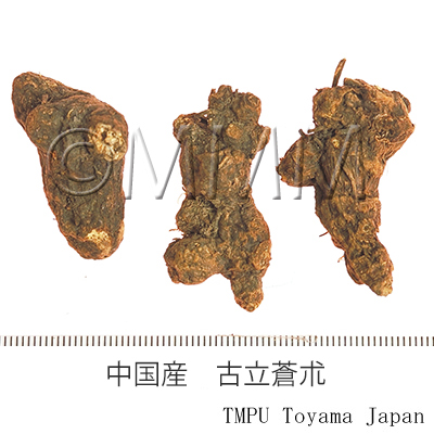 | 備考 | 茅朮(毛朮,漢蒼朮)は A. lancea ホソバオケラ(湖北,江西,江蘇省などに産す),津蒼朮(山蒼朮)は A. chinensis シナオケラ(河北,河南,山西省に産す),北鮮蒼朮は A. koreana Kitam. (= A. lancea DC. var. simplicifolia Kitam.) ナンマンオケラ(吉林,遼寧省,朝鮮半島北部に産す),韓蒼朮は A. japonica Koidz. オケラ(中国東北地方,朝鮮半島,日本に産す)である.江蘇省茅山産の茅朮は品質のよいものとして特に有名である.精油成分が蒼朮の表面に,白色の綿状に析出し,カビと見誤ることが多いが,beta-Eudesmol と Hinesol の混晶であり,良質のものである証拠である. 近年,精油成分の特徴から,A. lancea には茅山型,湖北・安徽型,大別山型があり,A. chinensis には北部型と南部型があることが報告されている.A. lancea, A. chinensis, A. koreana に由来する蒼朮は Atractylodin を共通して含み,これを含まない A. japonica 及び A. ovata 由来の白朮とは明瞭に区別される. | |||||