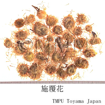 | 備考 | 中国では Inula chrysantha Diels. (広東, 広西, 湖南, 江西),I. serrata Bur., I. serrata Bur. var. hupehensis Ling (湖北, 貴州),I. salicina L. (北方地区) などの頭花が用いられる.かつて日本産 (奈良県) 旋覆花が大坂市場に出まわったことがあったが,これは ノコンギク Aster ageratoides Turcz. subsp. ovatus (Fr. et Sav.) Kitam. の小頭花であった.また韓国産旋覆花の中には サワオグルマ Senecio pierotii Miq. = S. campestris DC. pro parte の小頭花があり,ともに偽品である. | |||||