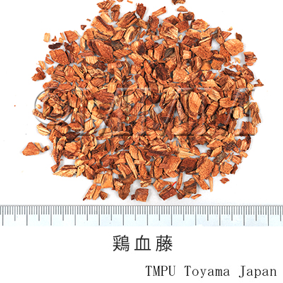 | 備考 | 広東,広西の一部の地区では,マメ科の Millettia nitida Benth. の茎を鶏血藤,血節藤,血藤,血筋藤などと称する.また江西省の豊城,雲南省鳳慶,四川省などに産する鶏血藤は Millettia dielsiana Harms の茎であり,豊城鶏血藤(江西),貫腸血藤(四川)とも称する.その他鶏血藤と称する商品は非常に種類が多い. 江西,陜西,河北,山東,山西,内蒙古,東北諸省などでは 血藤科/Sargentodoxaceae の Sargentodoxa cuneata (Oliv.) Rehd. et Wils. (= Holboellia cuneata Oliv.) 大血藤の茎を「鶏血藤」として用いる場合があるが,このものは元来大血藤,紅藤,活血藤,大活血,花血藤,血藤,血木通などと称するもので,混用すべきものではない. | |||||